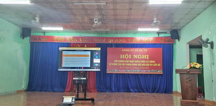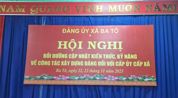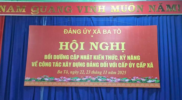 Trong hai ngày 22 và 23/11/2025, Đảng ủy xã Ba Tô đã tổ chức tham dự Hội nghị bồi dưỡng, cập nhật kiến thức, kỹ năng về công tác xây dựng Đảng dành cho cấp ủy cấp xã do Học viện Chính trị Quốc gia Hồ Chí Minh chủ trì và truyền hình trực tuyến đến các điểm cầu trên toàn quốc. Điểm cầu xã Ba Tô được bố trí tại Nhà Văn hóa xã, bảo đảm đầy đủ các điều kiện cơ sở vật chất, kỹ thuật phục vụ hội nghị.