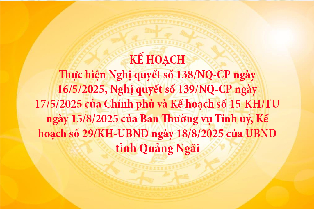 Kế hoạch thực hiện Nghị quyết số 138/NQ-CP ngày 16/5/2025, Nghị quyết số 139/NQ-CP ngày 17/5/2025 của Chính phủ và Kế hoạch số 15-KH/TU ngày 15/8/2025 của Ban Thường vụ Tỉnh uỷ, Kế hoạch số 29/KH-UBND ngày 18/8/2025 của UBND tỉnh Quảng Ngãi