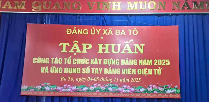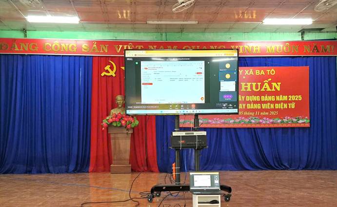 Thực hiện chỉ đạo của Văn phòng Tỉnh ủy Quảng Ngãi về việc tổ chức Hội nghị trực tuyến tập huấn ứng dụng Sổ tay đảng viên điện tử, chiều ngày 05/11/2025, Ban Thường vụ Đảng ủy xã Ba Tô đã tổ chức điểm cầu trực tuyến tại Nhà Văn hóa xã Ba Tô.
